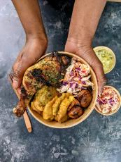 LE DAHOMEY : Poulet braisé aux épices Jerk, Plantins sucrées ou bananes pesées, Salade pikiliz, Sauce sucrée salée aux saveurs caribéens
